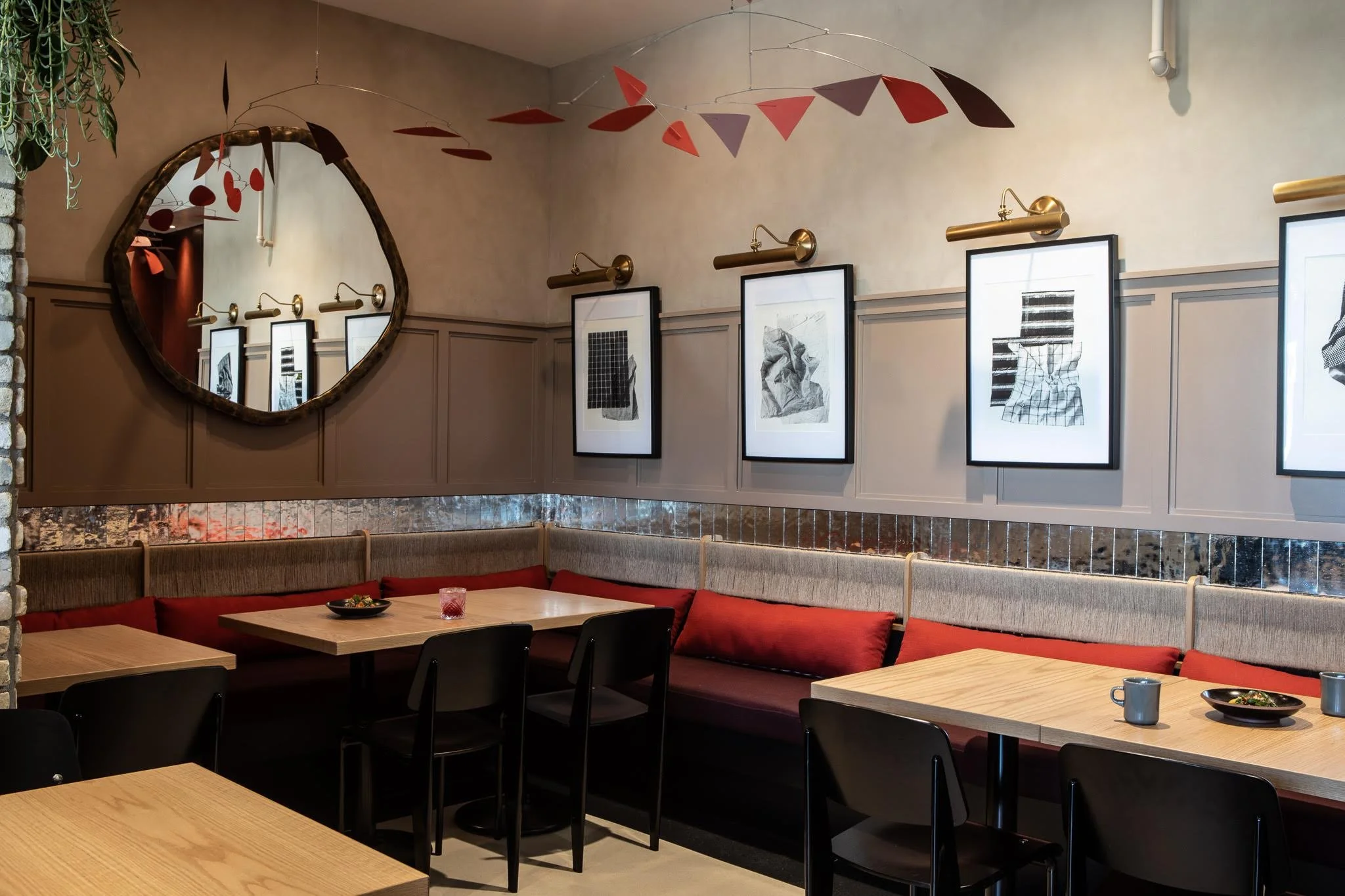 Using black and white images to compliment the warm tones of the restaurant, I screen printed overlapping patterned fabrics that evoke both tea towels that can be found in the kitchen and warm comforting textiles from home.