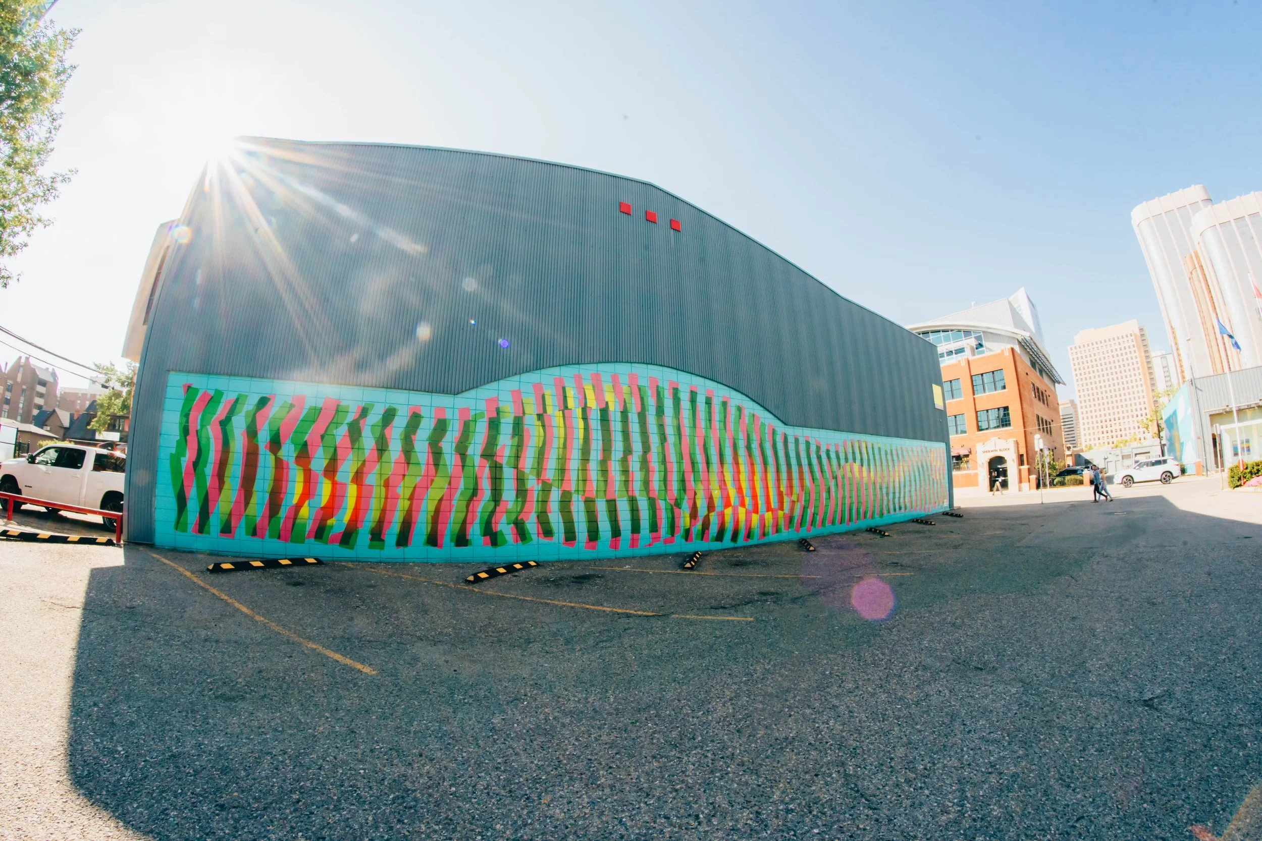 I was extremely honoured to be one of 16 artists selected for Calgary’s 2023 BUMP Mural Festival. My piece, Multiply Layer is about the tension between digital and analogue modes of making an image. This mural is inspired by the manipulation of fabric and how the patterns on the surface become warped with the physicality of its wrinkles. By overlaying a similar pattern over top, a moire effect is produced. This phenomenon is common in photography but often edited out. By intentionally producing these lines, their geometry can be examined without the threat of deletion. Their non-digital, painted presence as the focal point of this piece legitimizes the pattern as a dynamic, moving form as opposed to an undesirable mistake.